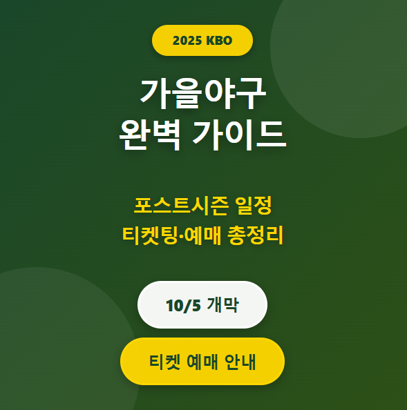 2025 KBO 포스트시즌 일정부터 티켓 예매 방법, 관전 꿀팁까지 한눈에 정리했습니다. 10월 5일 개막하는 가을야구, 아래 카드 형식으로 보기 쉽게 구성했으니 스크롤을 내리면서 광고 영역도 함께 확인해 보세요.