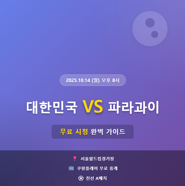 2025년 10월 14일 오후 8시, 서울월드컵경기장에서 열리는 한국 vs 파라과이 친선경기를 무료로 시청하는 방법을 정리했습니다. 쿠팡플레이 무료 시청부터 TV 중계까지 한눈에 확인하세요.